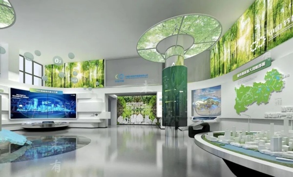 設計亮點:墻面以再生水處理為主題,采用抽象化的水循環紋理,搭配藍色燈光,營造出科技感十足的氛圍。頂部設置透明投影屏幕,展示再生水處理的過程。地面鋪設藍色地毯,搭配小型再生水處理模型,展示再生水利用的工程技術。