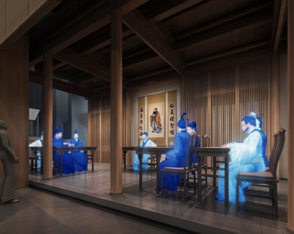 中正平和,成為“中庸之道”的主要內(nèi)涵和重要體現(xiàn),展館空間結(jié)合建筑軸網(wǎng)安排,形成中正平和,有序組織的空間布局形態(tài),成為設(shè)計(jì)理念在空間設(shè)計(jì)上的體現(xiàn)。整體設(shè)計(jì)以柔和的和諧氛圍呈現(xiàn),弱化設(shè)計(jì)形態(tài)、色調(diào),材質(zhì)上的互沖,體現(xiàn)儒學(xué)所蘊(yùn)含的和善思想與和合精神。