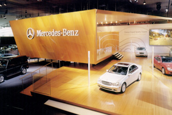 梅賽德斯-奔馳公司展示空間設(shè)計(jì)由辛德勒建筑師事務(wù)所設(shè)計(jì),?該展場的設(shè)計(jì)是三面敞開的空間,剩下一面則由另一個參展商的展場界定。梅賽德斯一奔馳公司的展場由一個可供穿行的雕望體和各式各樣的展示地板所組成,從展場中心能很容易地到達(dá)任何一處。