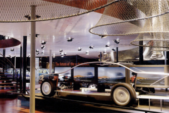 該展場是奔馳公司為在巴塞羅那舉行的展會而設計的,其設計理念主要源自劇場空間的序列,即以刷院門廳為起始,終結于劇場大廳。展場空間依循此理念,將展示空聞全部展示給參觀者,而不是用封閉的墻或門將展示空間分隔成許多零碎的小空間。而開放的展示空間在全部呈現給觀眾的同時,也顯示出各個空間的個性來。