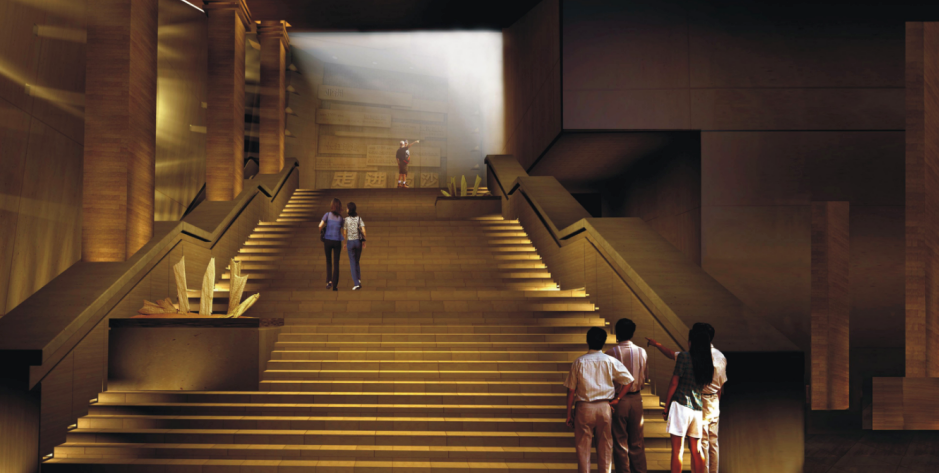 引入了遺址類博物館典型特征的探孔及探方的設計元素,在強烈的背光下,引導受眾將目光聚焦于放大的四鳥托日徽標上。在第一時間通過一個由小到大,由淺到深,由低潮到高潮的漸進過程。以金沙神秘、浪漫的文化氣息感染受眾。