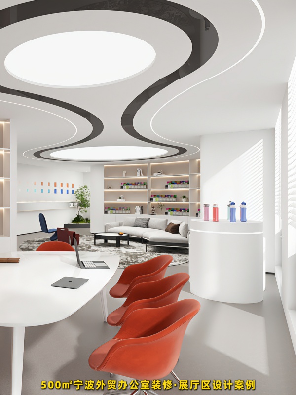 本案寧波辦公室裝修案例中的展廳設(shè)計以"展售美學(xué)"為基調(diào),通過展示系統(tǒng)、燈光設(shè)計、色彩引導(dǎo)三大手法打造沉浸式體驗空間。